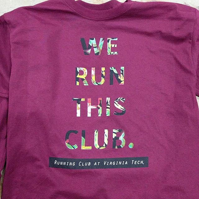 We run this club – Running Club at Virginia Tech #virginiatech #hokies #running #runner #blacksburgva #crosscountry #werunthisclub 4 color CMYK process printing with a white underbase. Cool print!